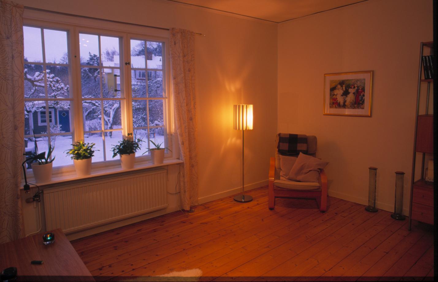Vy över vardagsrum med fönster i söder